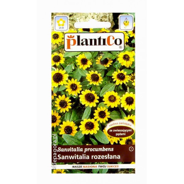 Sanvitalia procumbens. Roślina jednoroczna o zwieszających się pędach. Kwiaty żółte z ciemnym środkiem pojawiają się od czerwca do późnej jesieni. Polecana do obsadzania skrzynek balkonowych, kwietników oraz rabat.