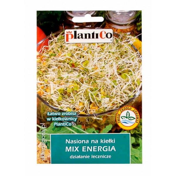 Mix Energia to mieszanka nasion na kiełki skomponowana z gatunków o działaniu wzmacniającym, energetycznym. Wpływają korzystnie na układ sercowo-naczyniowy i pokarmowy. Posiadają zdolność odtruwania organizmu jak również powstrzymują odkładanie "złego" cholesterolu.