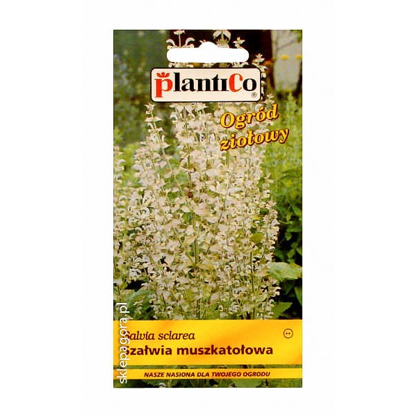 Salvia sclarea. Roślina dwuletnia. Łodygi proste, rozgałęzione z dużymi pomarszczonymi liśćmi i liliowymi, długo utrzymującymi się kwiatami. Wysokość rośliny wynosi 40-70 cm. Stanowisko słoneczne, gleba lekka, zasadowa i dobrze spulchniona.
